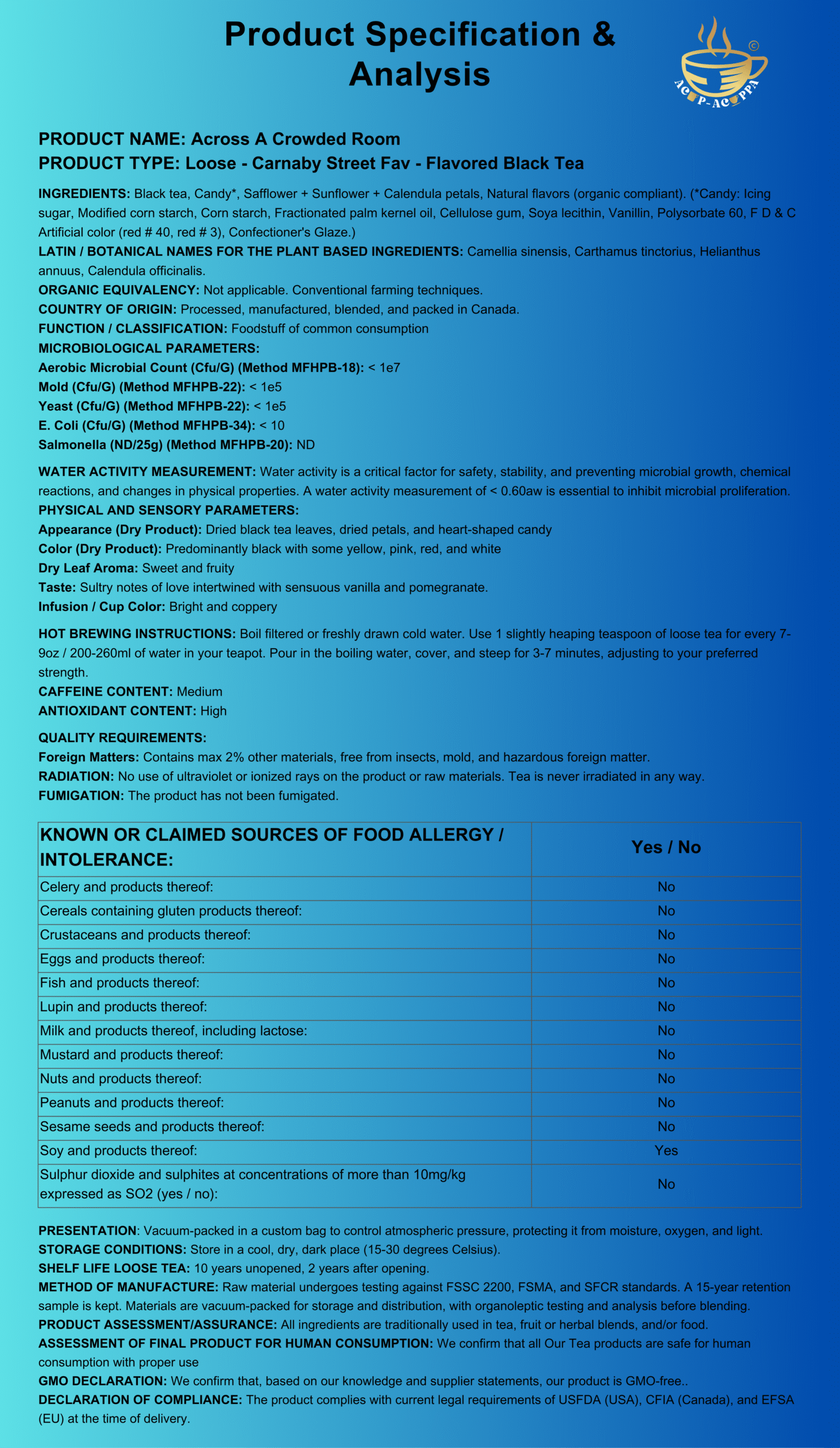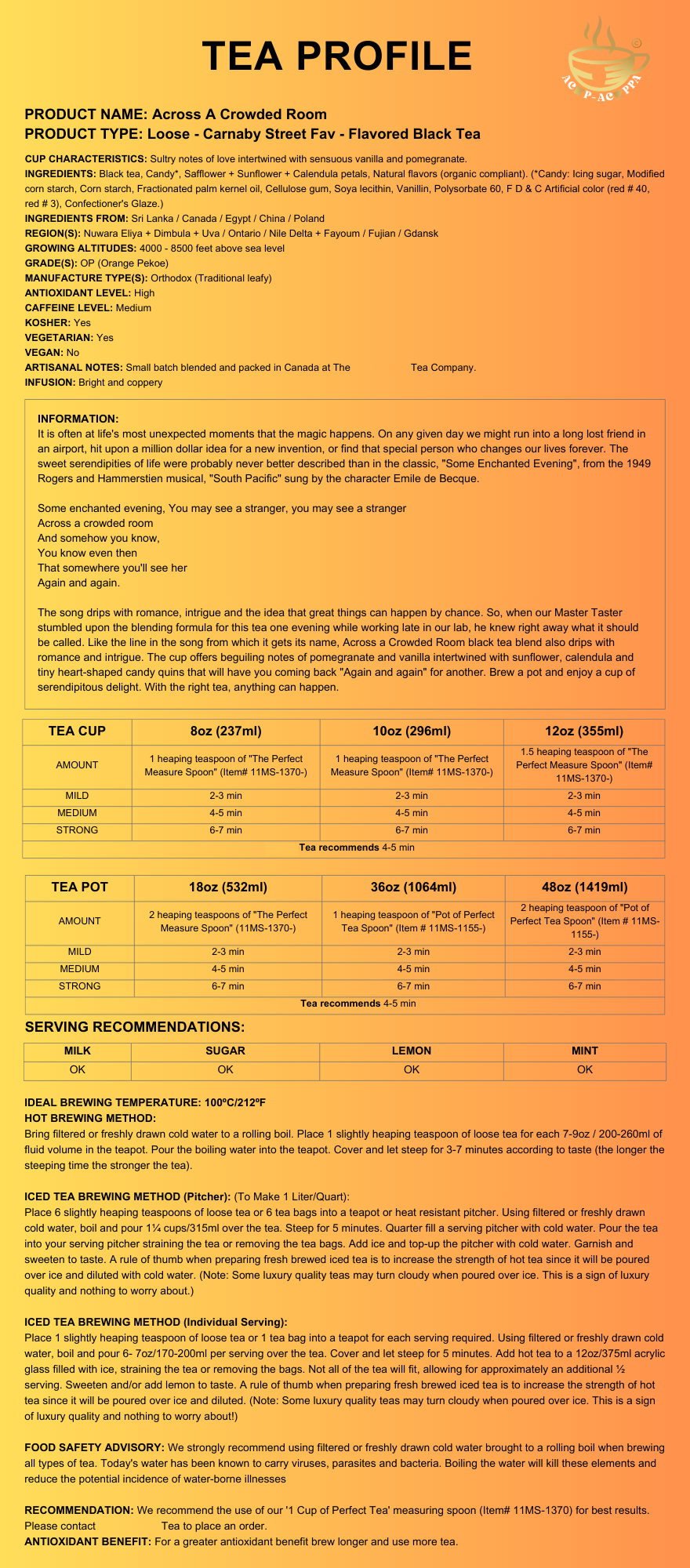 Luxury Ingredients: Black tea, Candy*, Safflower + Sunflower + Calendula petals, Natural flavors (organic compliant). (*Candy: Icing sugar, Modified corn starch, Corn starch, Fractionated palm kernel oil, Cellulose gum, Soya lecithin, Vanillin, Polysorbate 60, F D & C Artificial color (red # 40, red # 3), Confectioner’s Glaze.) **Allergen Alert – Contains Soy**