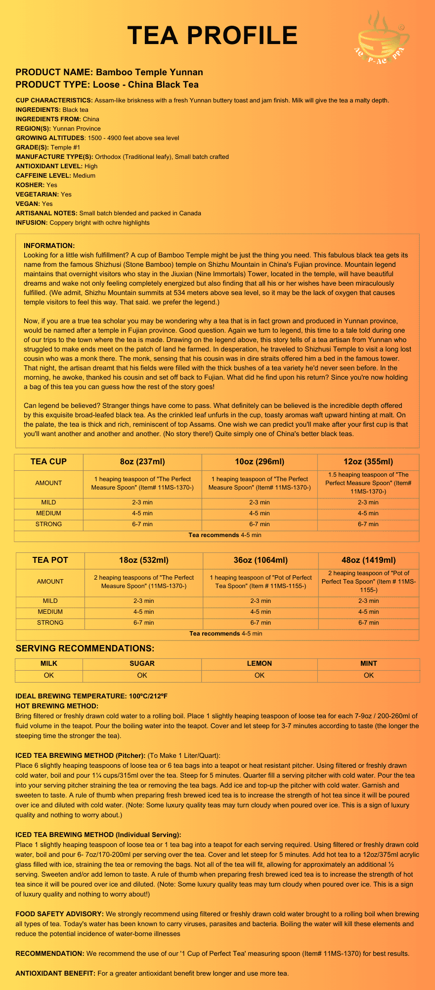 Assam-like briskness with a fresh Yunnan buttery toast and jam finish. Milk will give the tea a malty depth.