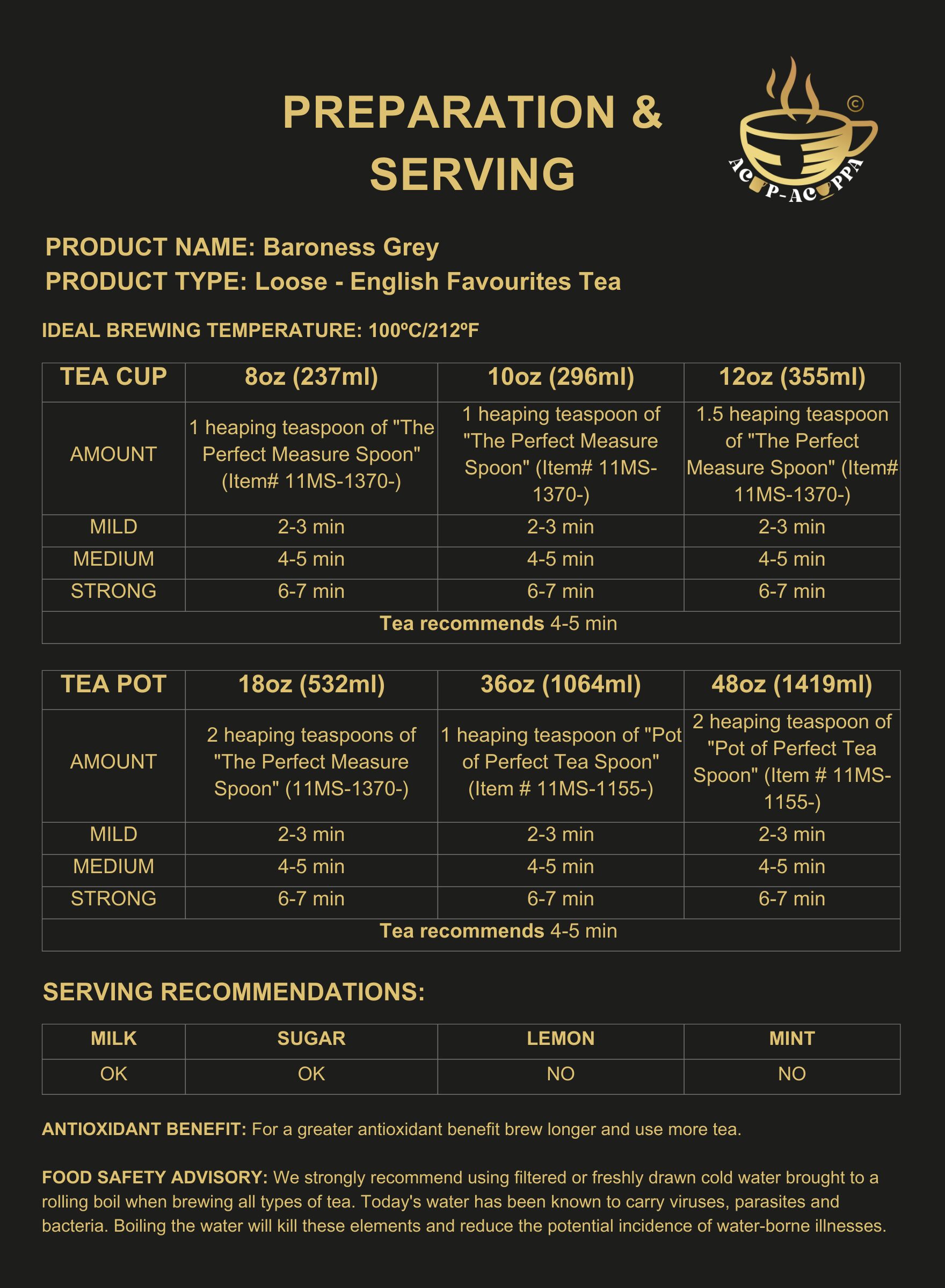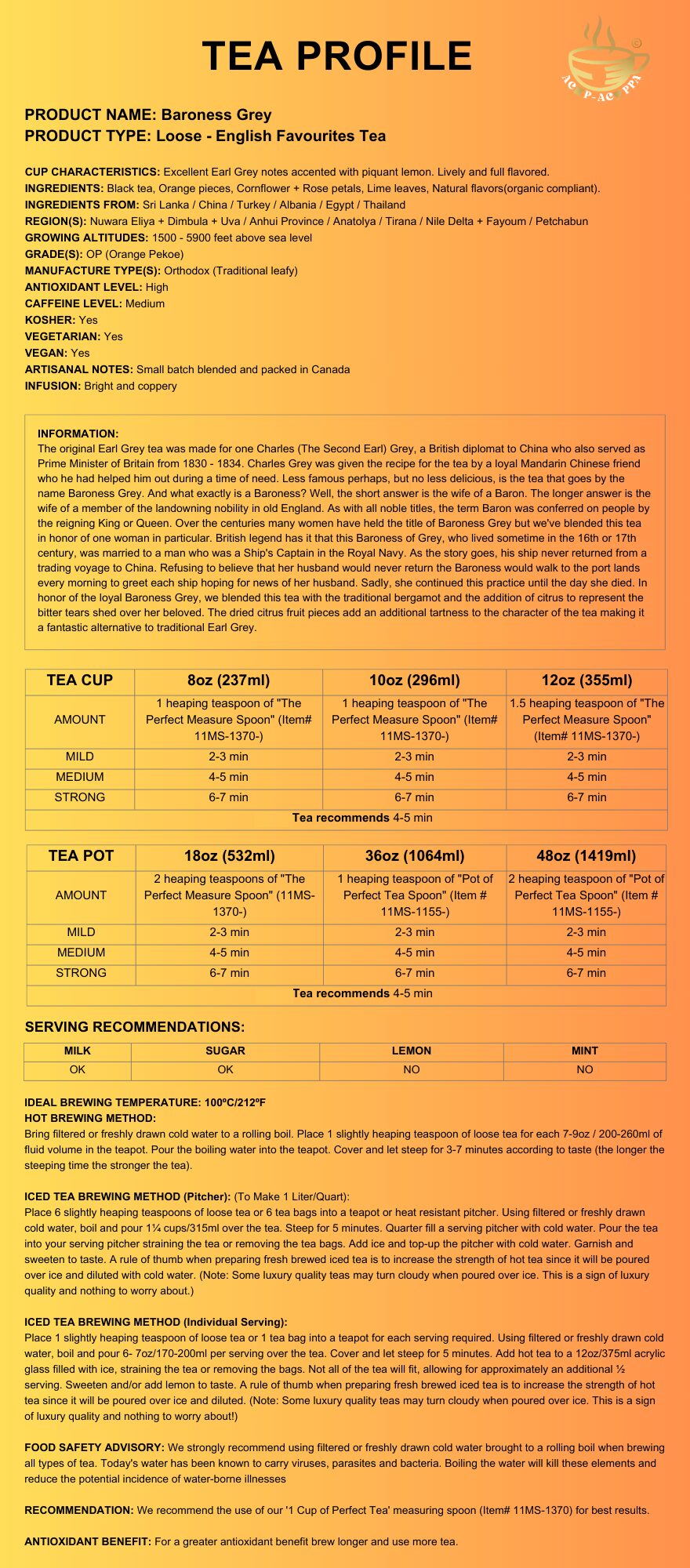 Excellent Earl Grey notes accented with piquant lemon. Lively and full flavored.