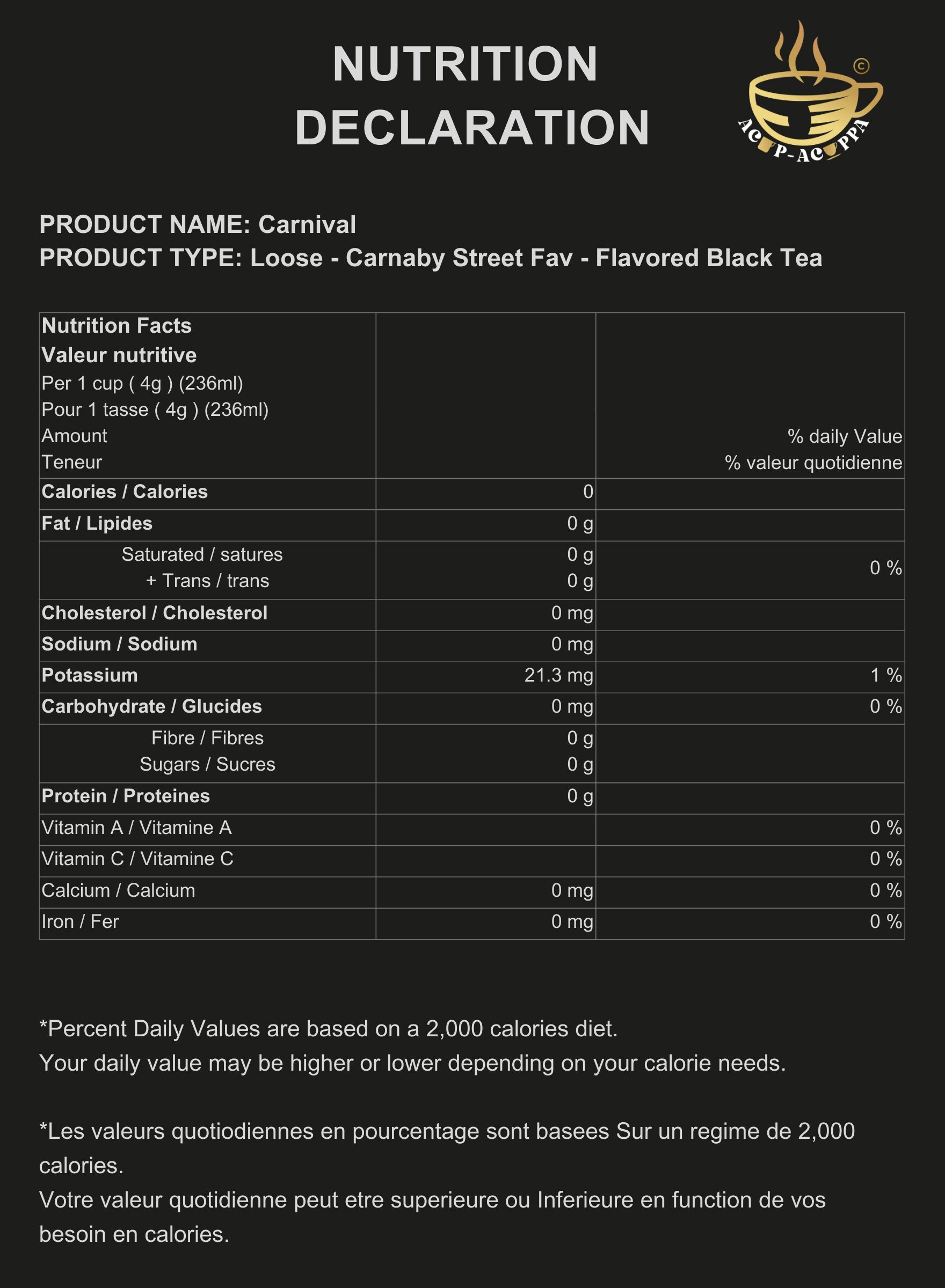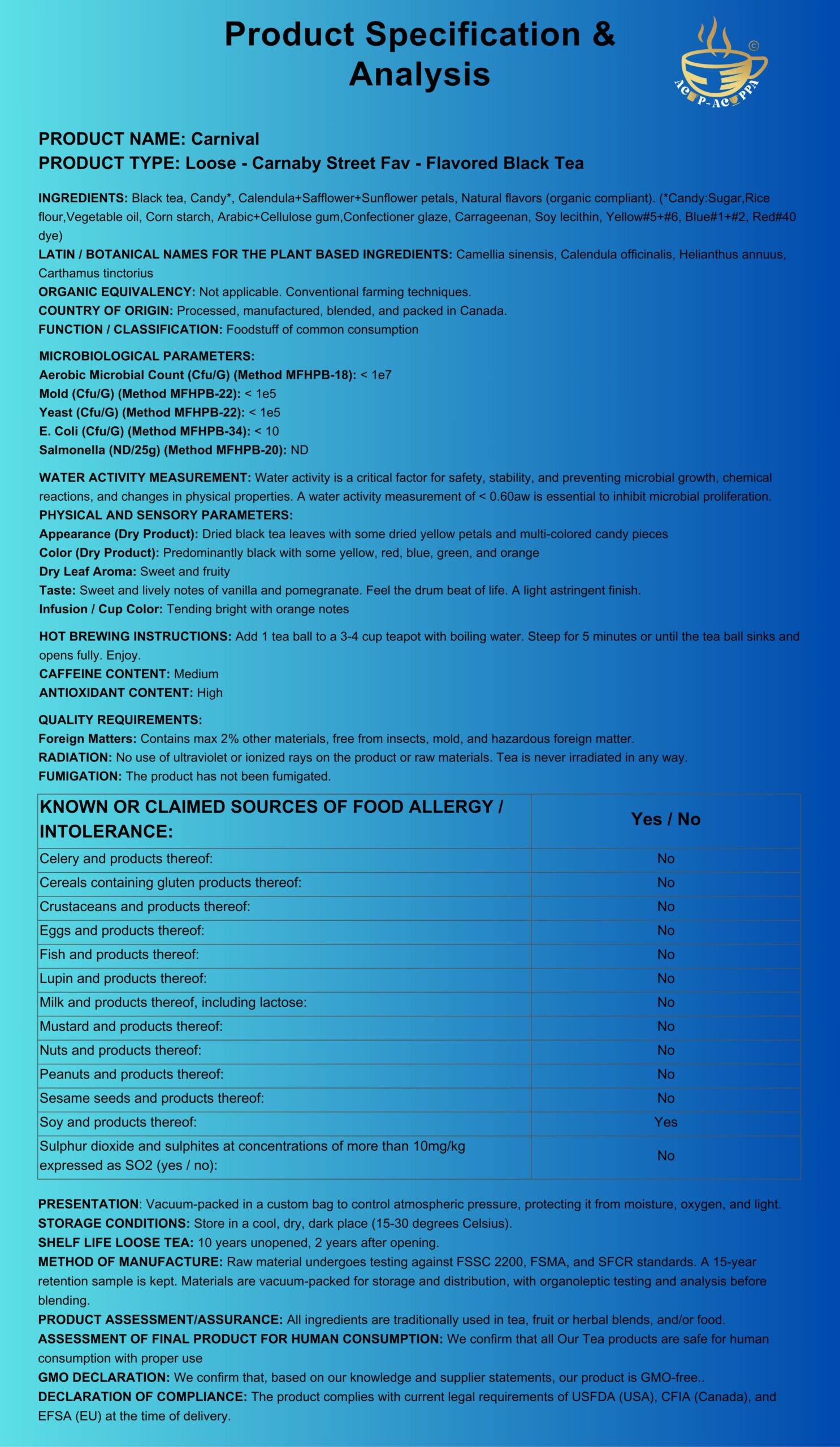 Luxury Ingredients: Black tea, Candy*, Calendula+Safflower+Sunflower petals, Natural flavors (organic compliant). (*Candy:Sugar,Rice flour,Vegetable oil, Corn starch, Arabic+Cellulose gum,Confectioner glaze, Carrageenan, Soy lecithin, Yellow#5+#6, Blue#1+#2, Red#40 dye) **Allergen Alert – Contains Soy**