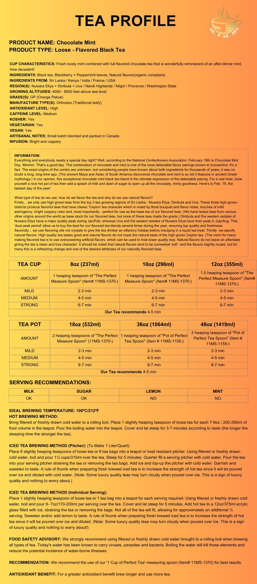 Fresh lovely mint combined with full flavored chocolate tea that is wonderfully reminiscent of an after-dinner mint. How decadent!
