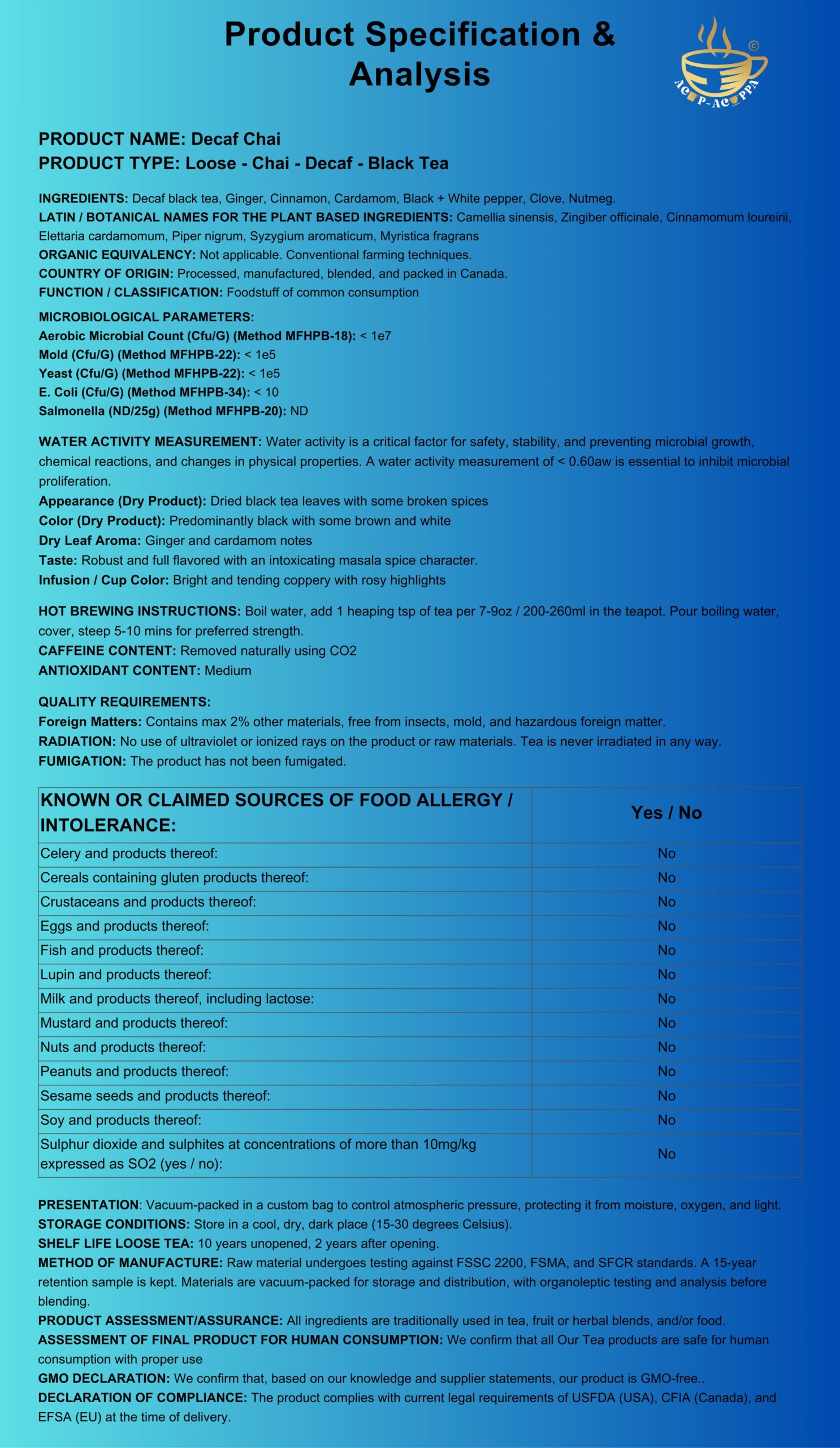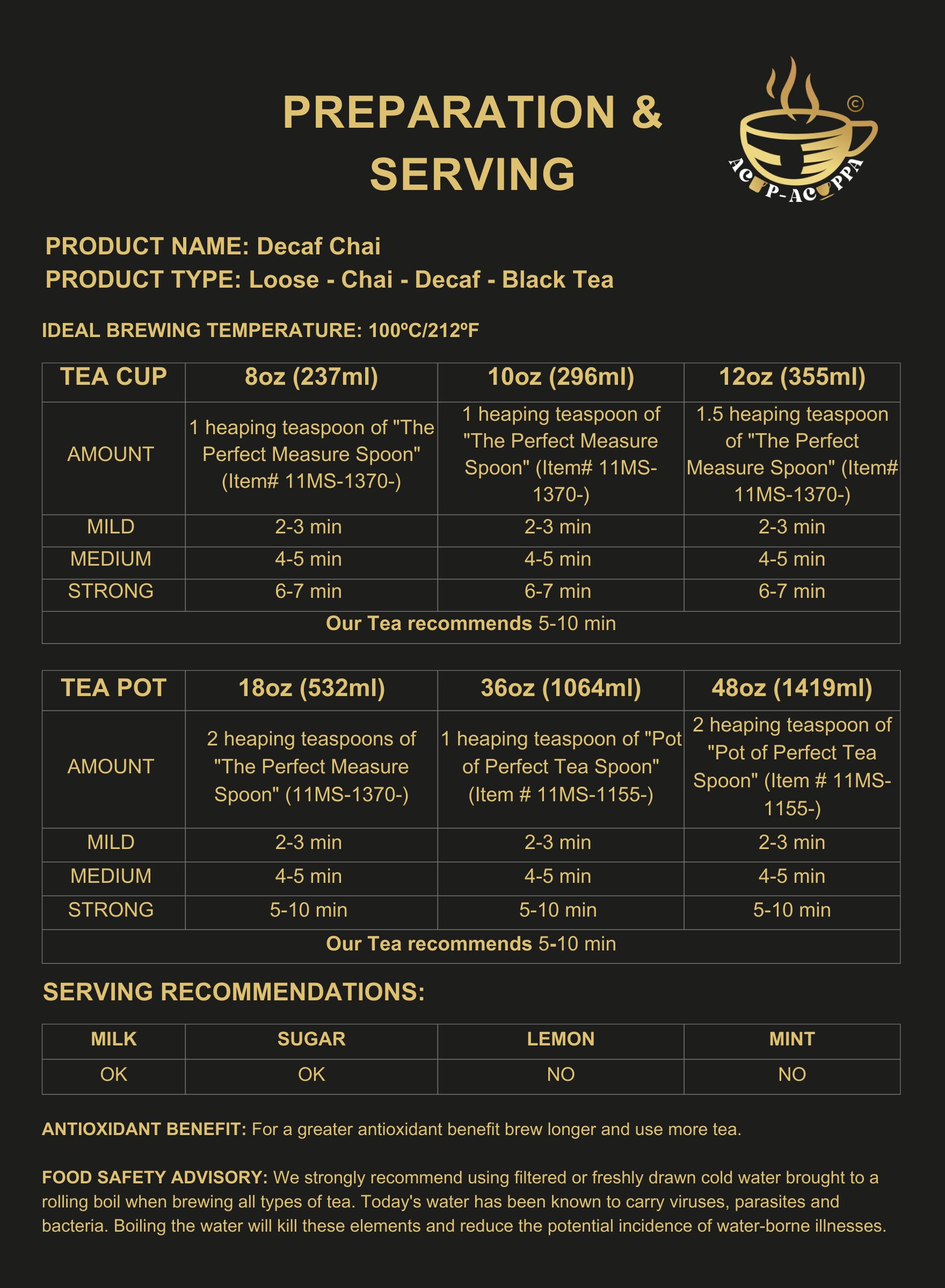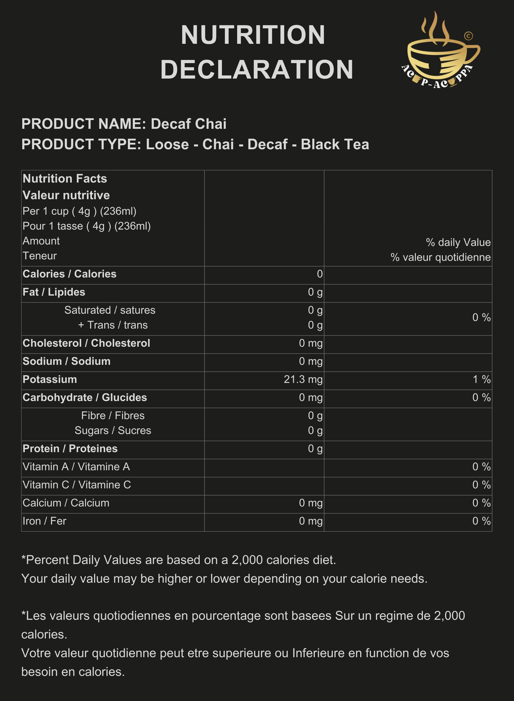 Luxury Ingredients: Decaf black tea, Ginger, Cinnamon, Cardamom, Black + White pepper, Clove, Nutmeg.