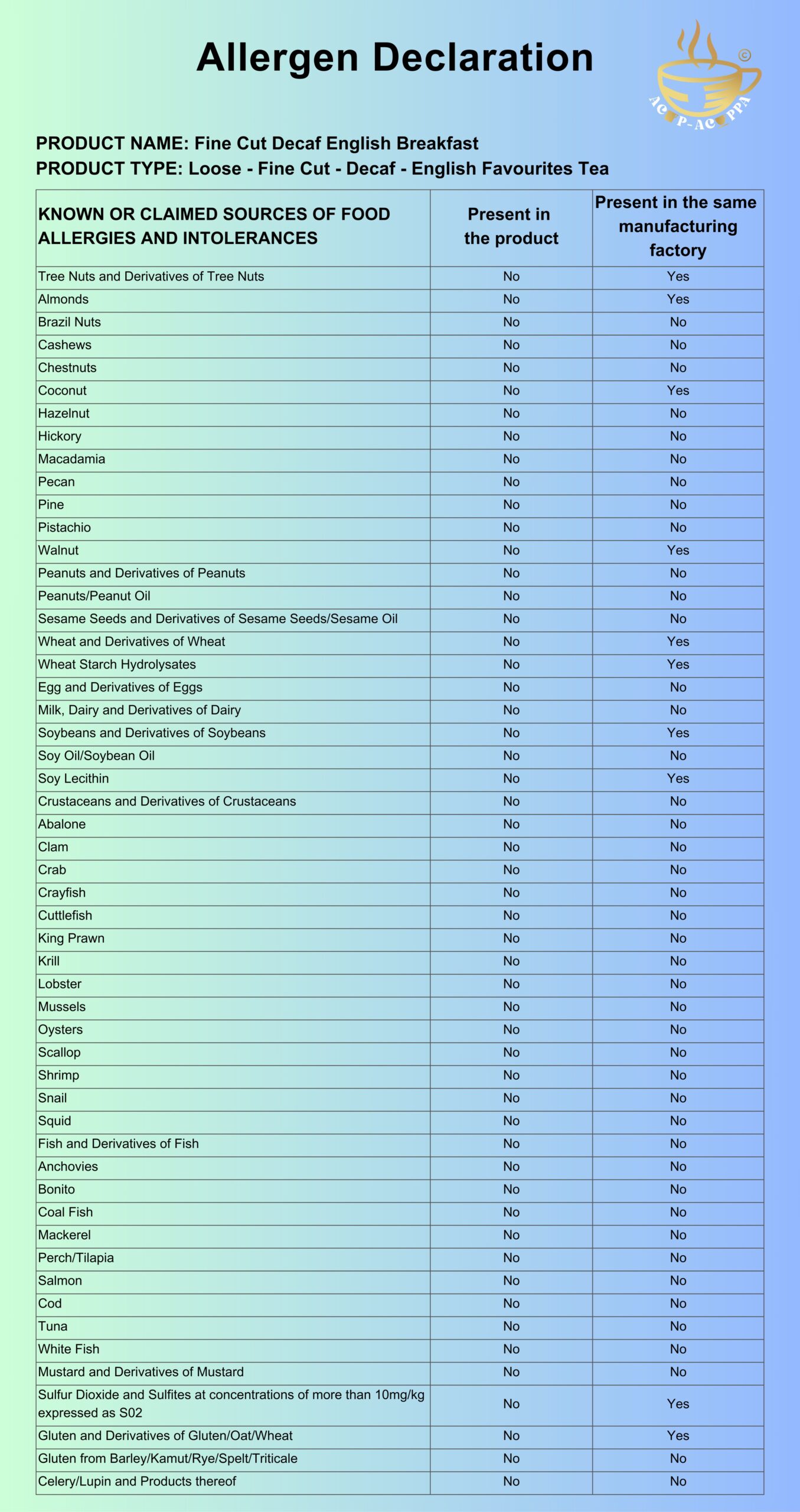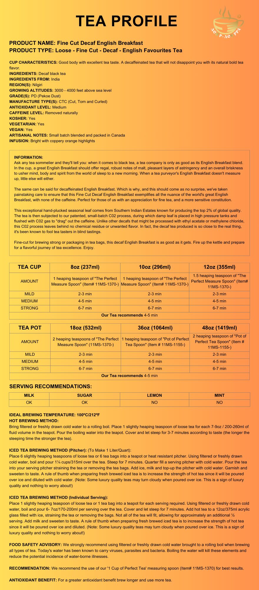 Good body with excellent tea taste. A decaffeinated tea that will not disappoint you with its natural bold tea flavor.