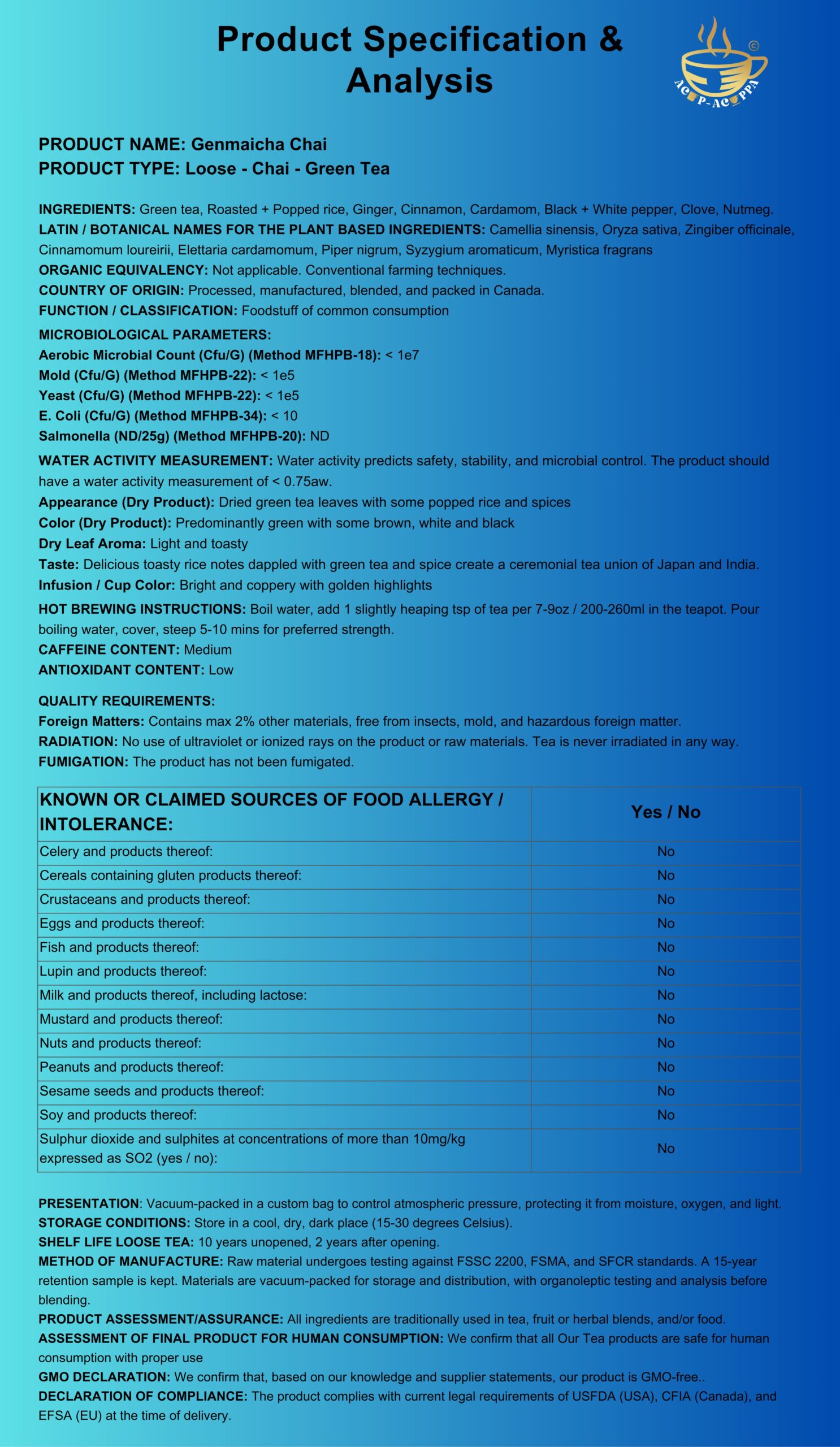 Luxury Ingredients: Green tea, Roasted + Popped rice, Ginger, Cinnamon, Cardamom Black + White pepper, Clove, Nutmeg.