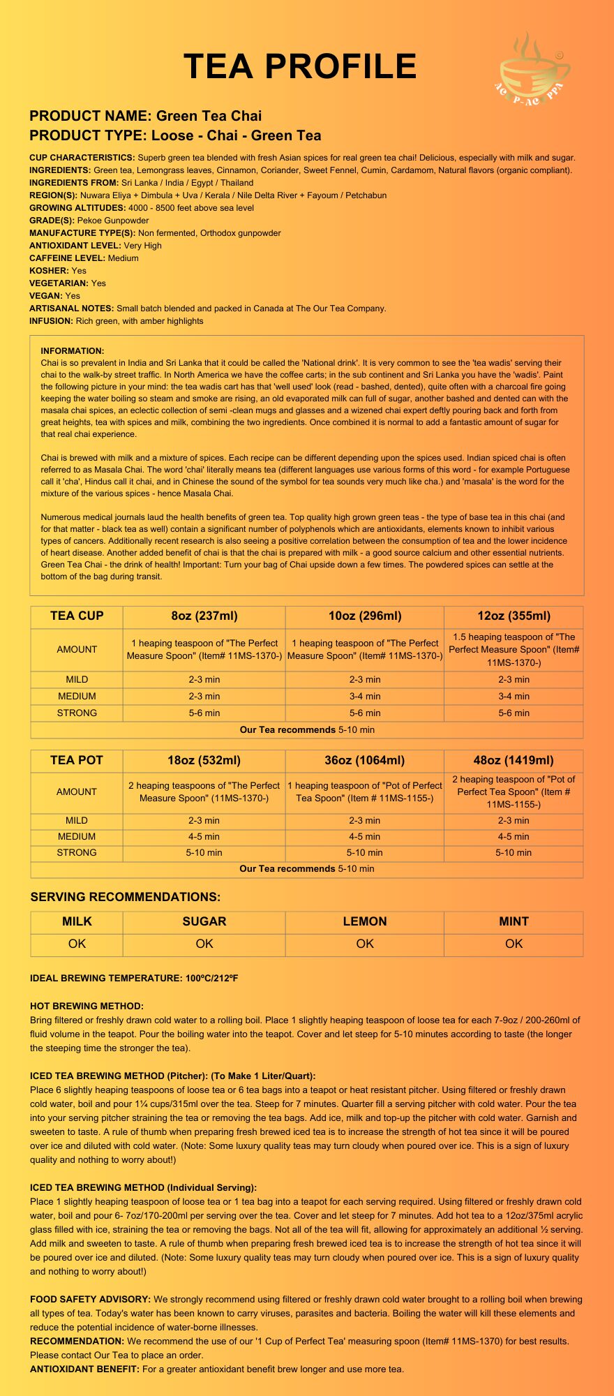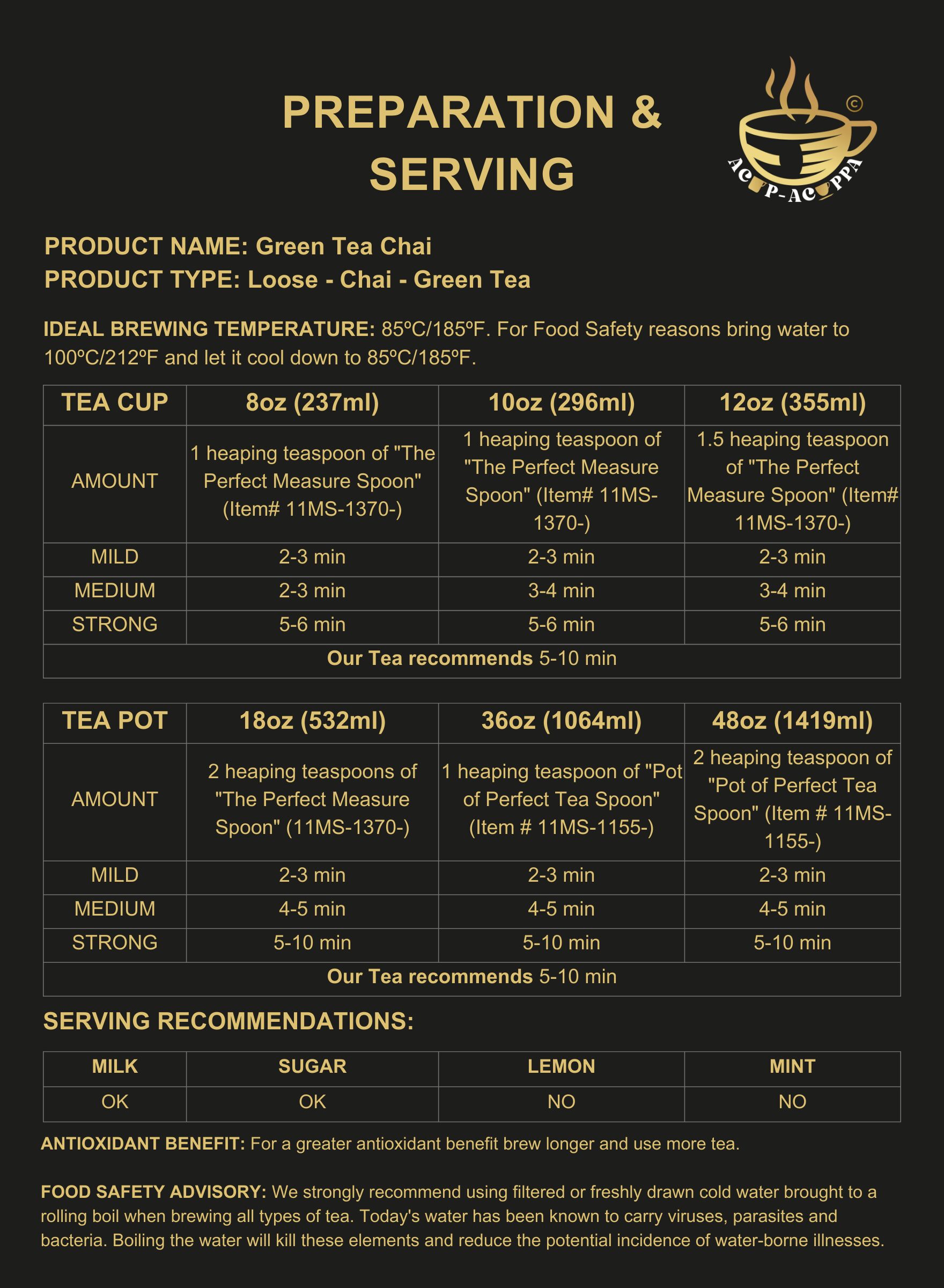 Superb green tea blended with fresh Asian spices for real green tea chai! Delicious, especially with milk and sugar.