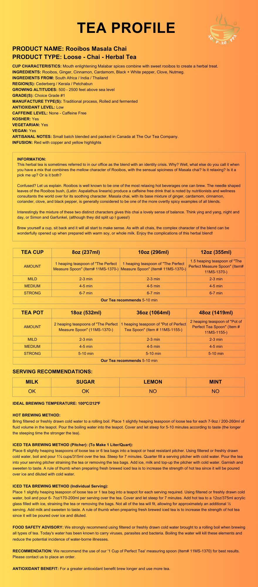 Mouth enlightening Malabar spices combine with sweet rooibos to create a herbal treat.